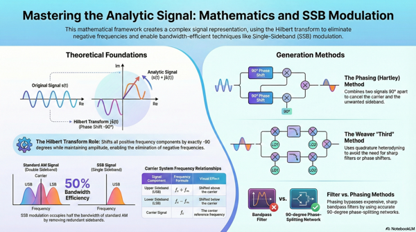 Explains analytic signals as the mathematical representation of SSB modulation. - A New Approach to Single Sideband – Generating SSSC by the “Phasing” Method – One Electron